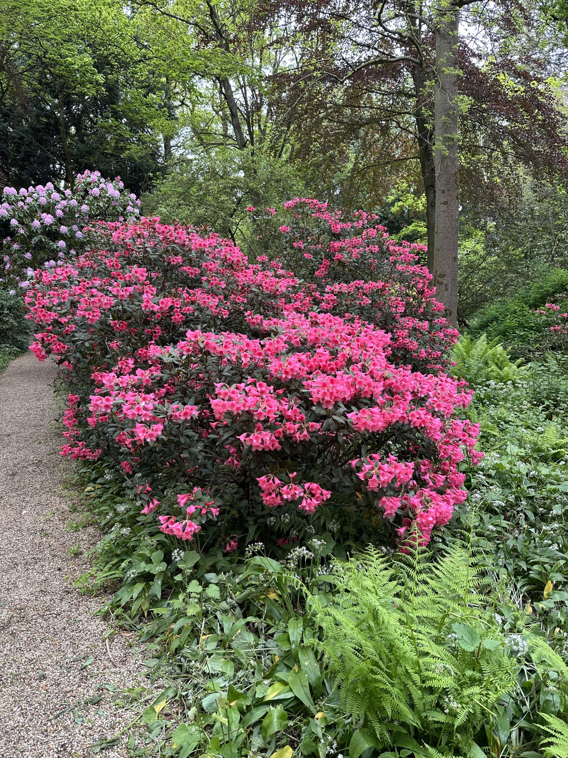 Key botanical elements include rhododendrons, azaleas, camellias, magnolias, and candelabra primulas that reach peak bloom during springtime.